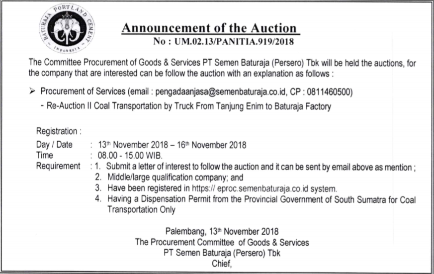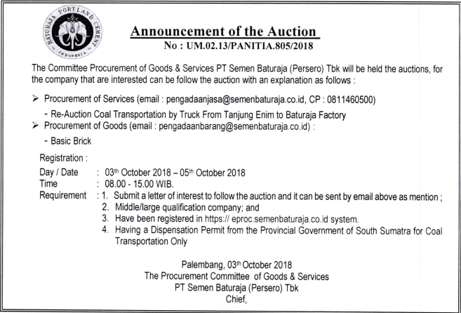 The committee procurement of Goods & Services PT Semen Baturaja (Persero) Tbk will held the auctions, for the company that are interested can be follow the auction with an explanation as follows: