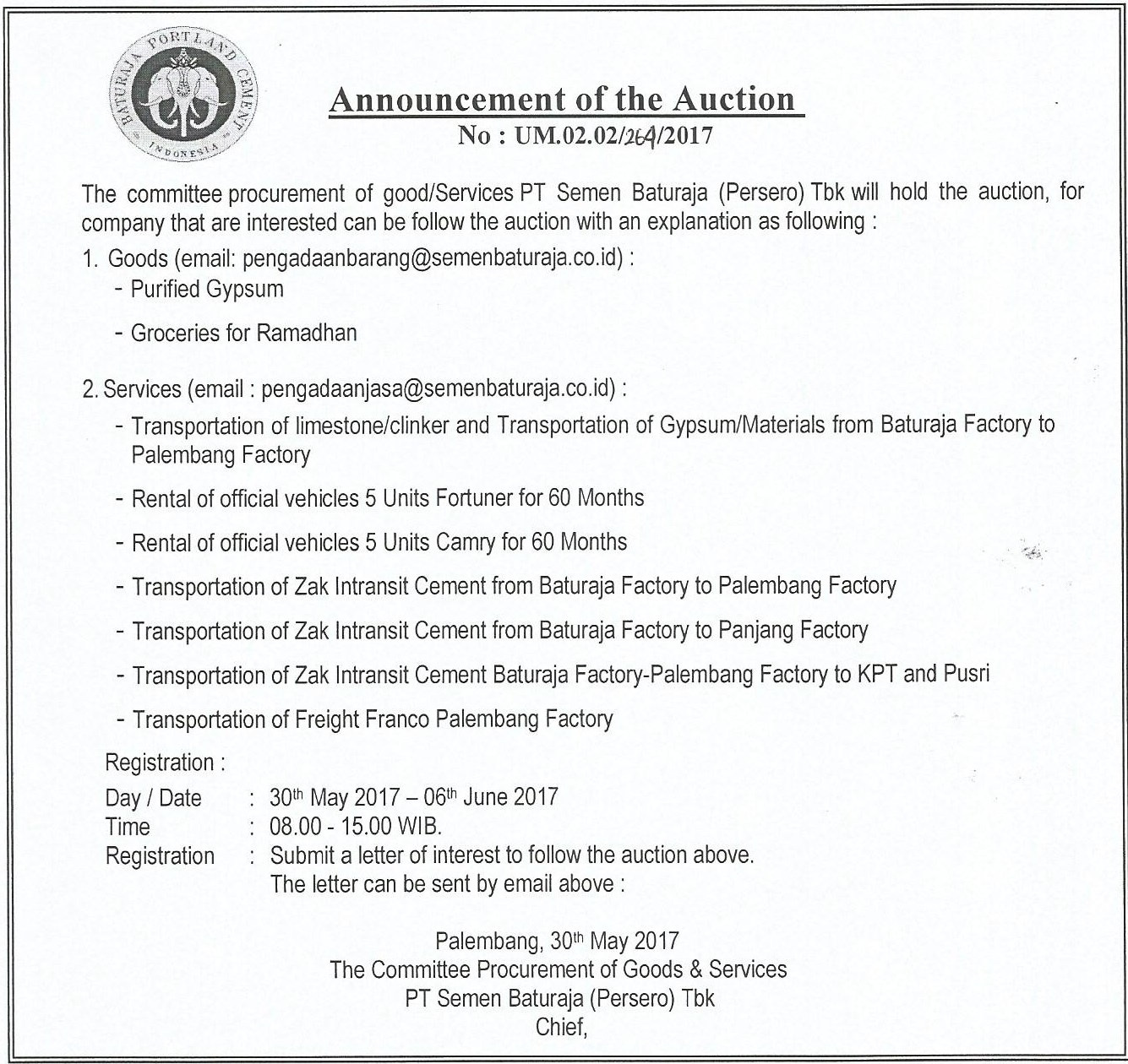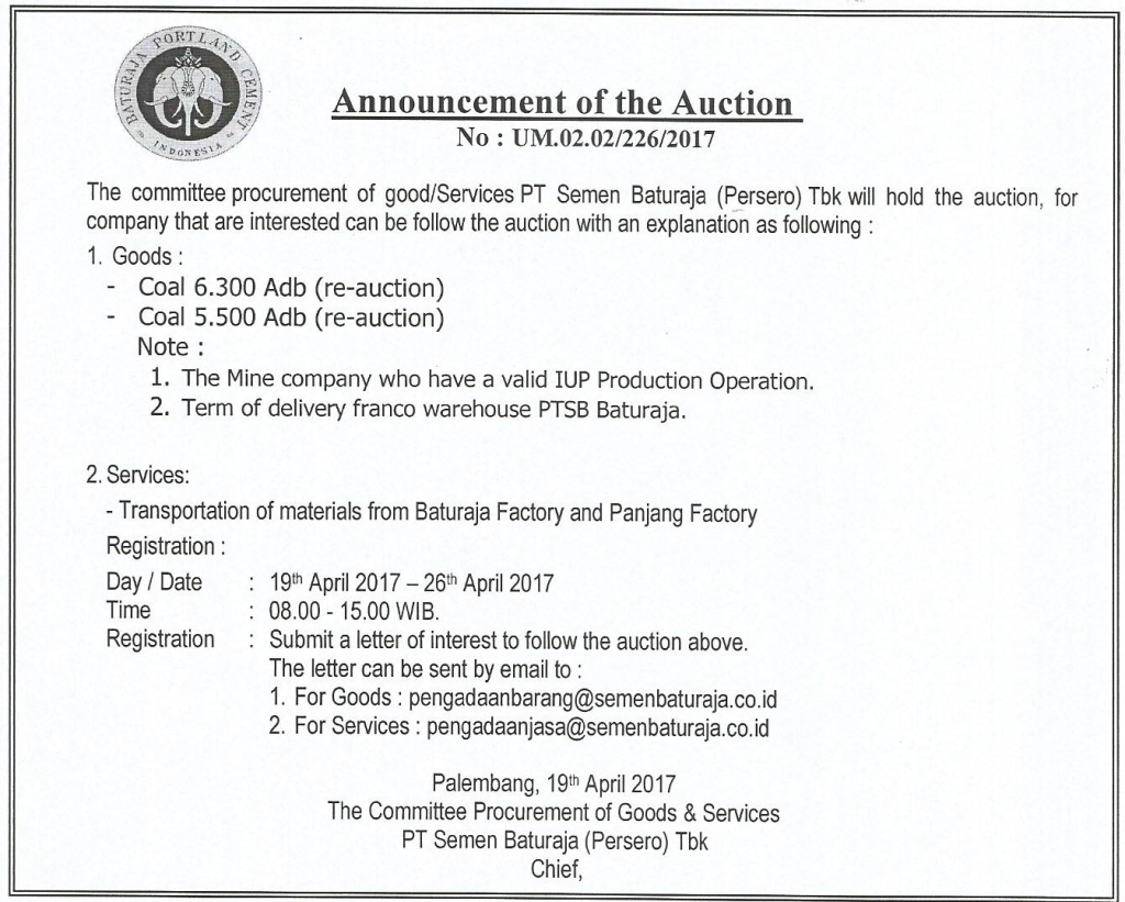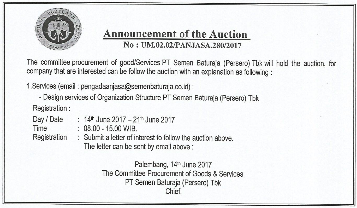 It is hereby The Board of Directors of PT Semen Baturaja (Persero) Tbk (in the next shall be called “The Company” will organize its Annual General Meeting of Shareholders, on Thursday, April 27, 2017.