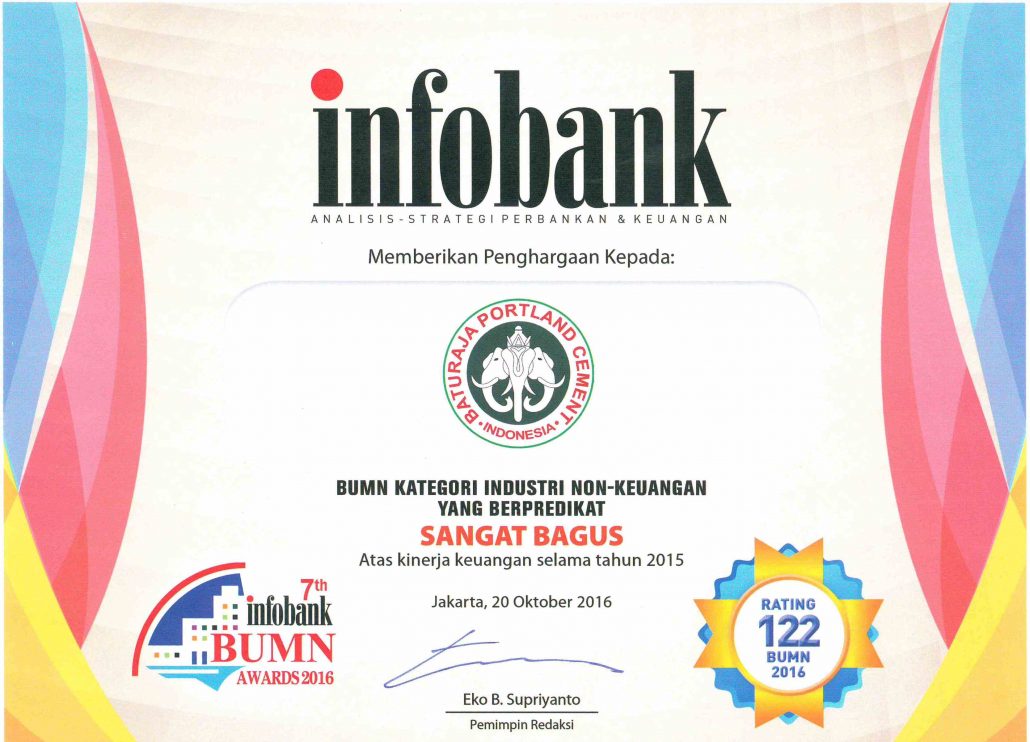Ranked 122 SOEs version Infobank 2016, produced 58 companies predicated as “Excellent”. The main assessment in the rating is based on the growth of the business and key financial ratios. In this award PT Semen Baturaja (Persero) Tbk secured the title of “Excellent”, in the category “Cement industry”.