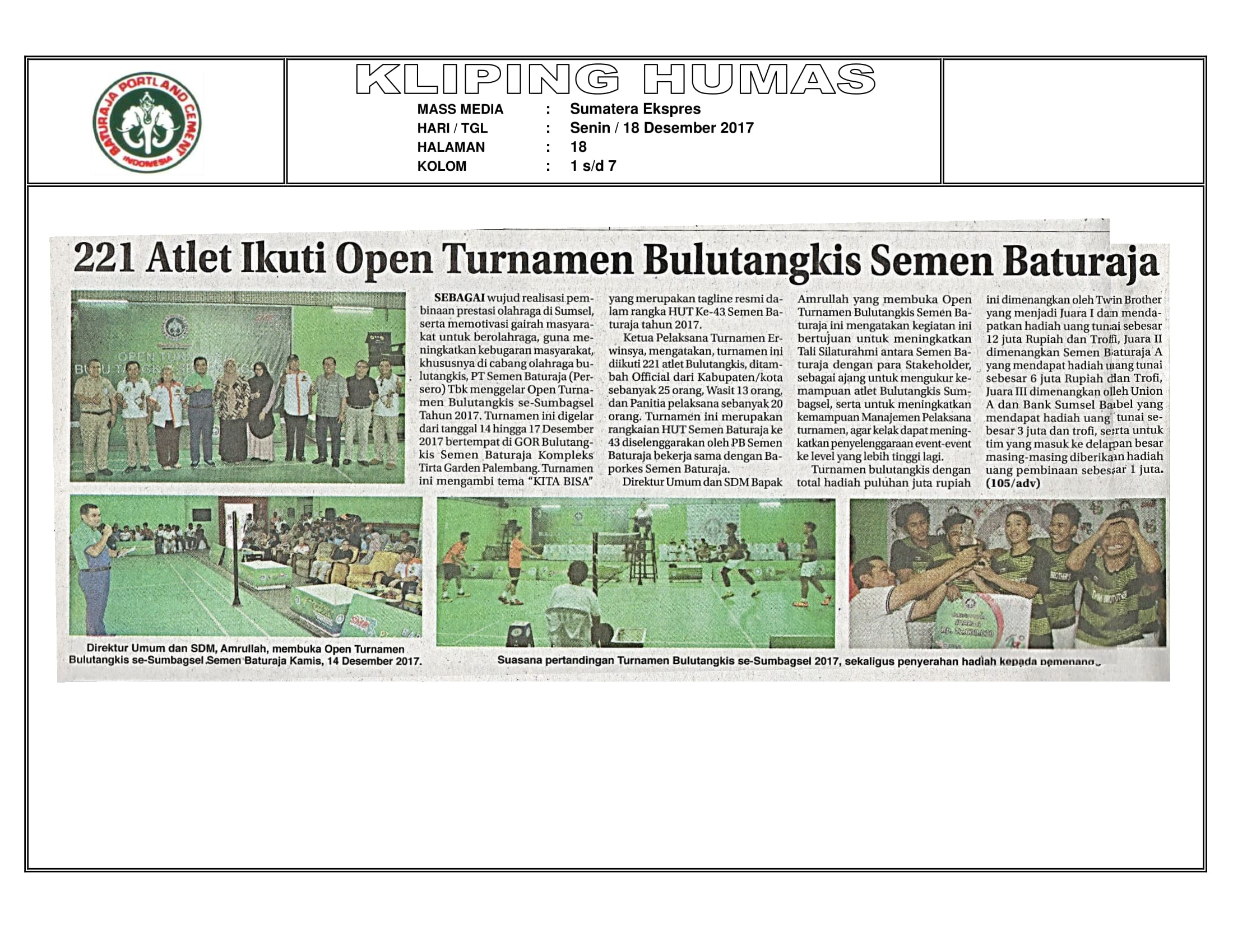Kliping Media : 221 Atlet Ikuti Open Turnamen Bulutangkis Semen Baturaja