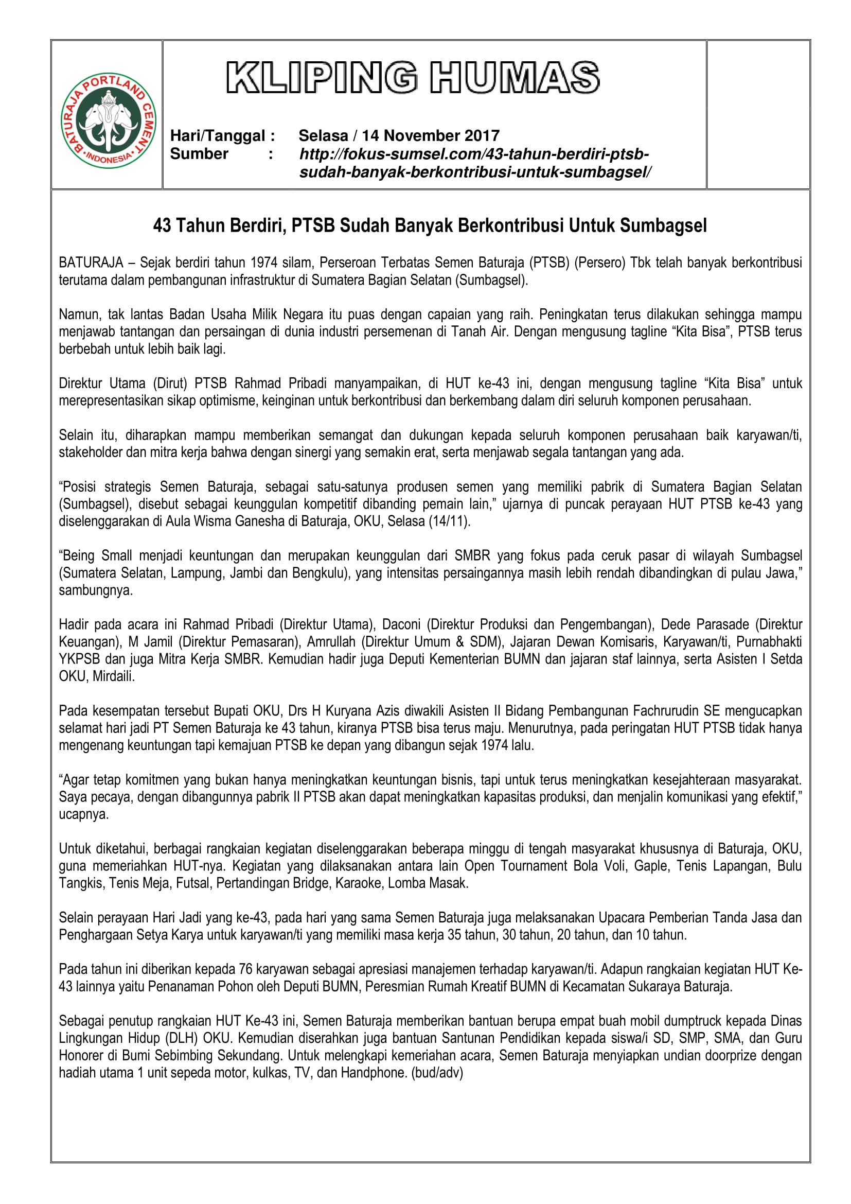 Kliping Media : 43 Tahun Berdiri, PT Semen Baturaja (Persero) Tbk Sudah Banyak Berkontribusi Untuk Sumbagsel