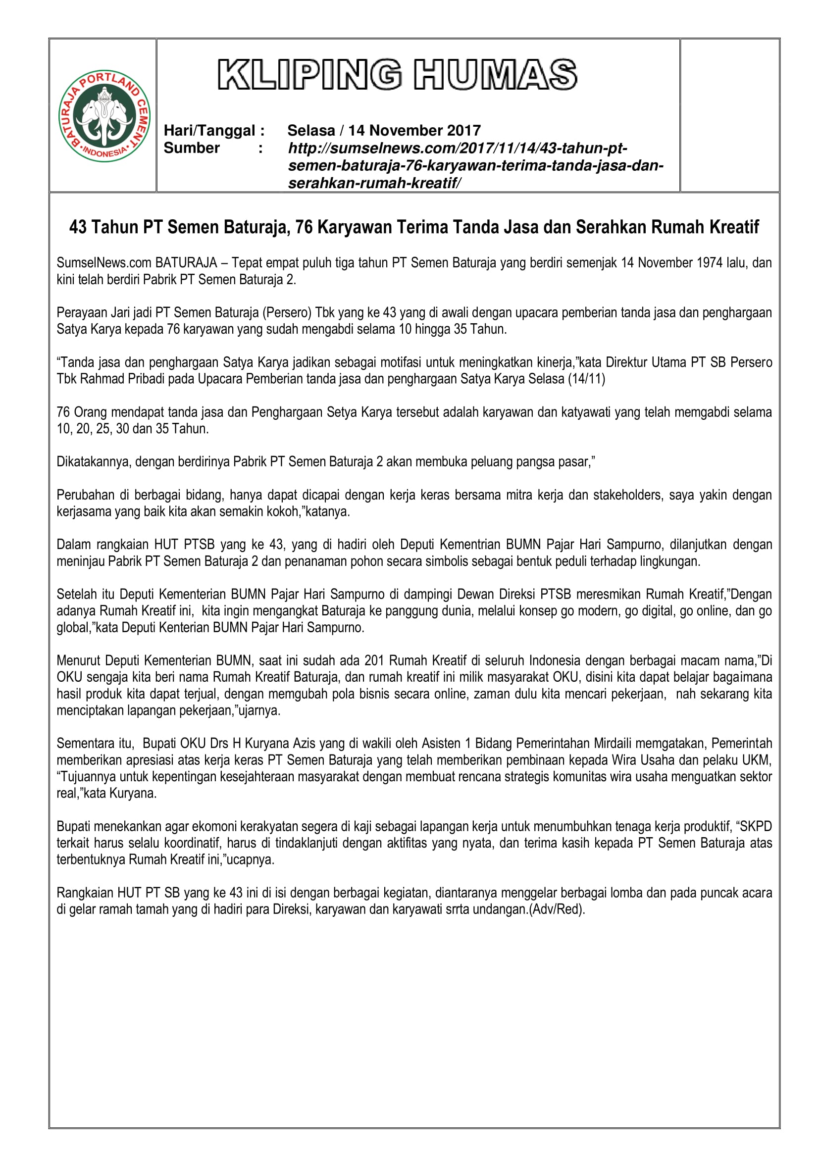 Admin SMBR2018-01-09 16:06:032018-01-09 16:06:03Kliping Media : 43 Tahun PT Semen Baturaja (Persero) Tbk, 76 Karyawan Terima Tanda Jasa dan Serahkan Rumah Kreatif Kliping Media : Hari Jadi ke-43 PT Semen Baturaja (Persero) Tbk, Kapasitas Bertambah,...Kliping Media : Target Produksi Semen Baturaja II 600,000 Ton