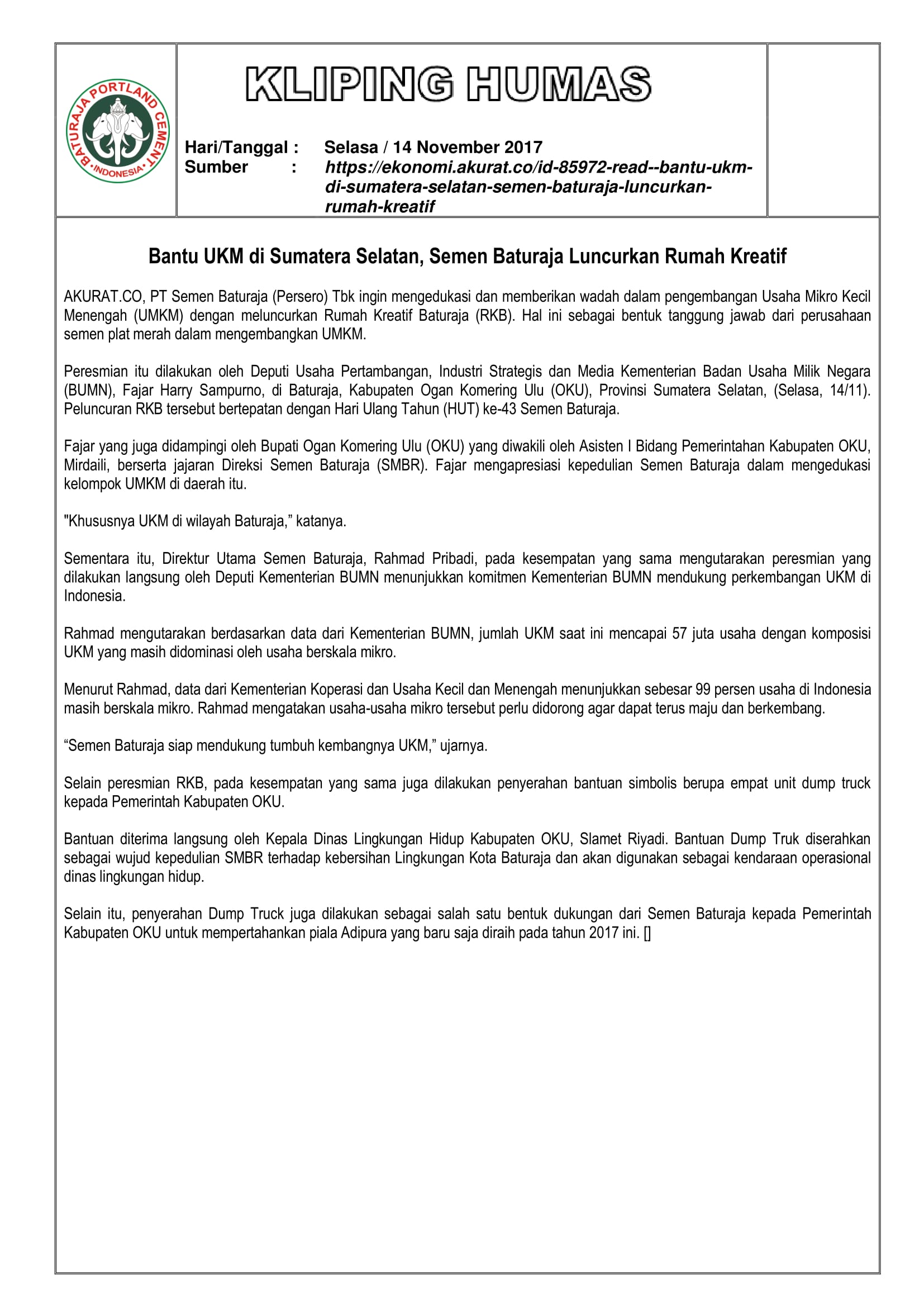 Kliping Media : Bantu UKM di Sumatera Selatan, Semen Baturaja Luncurkan Rumah Kreatif