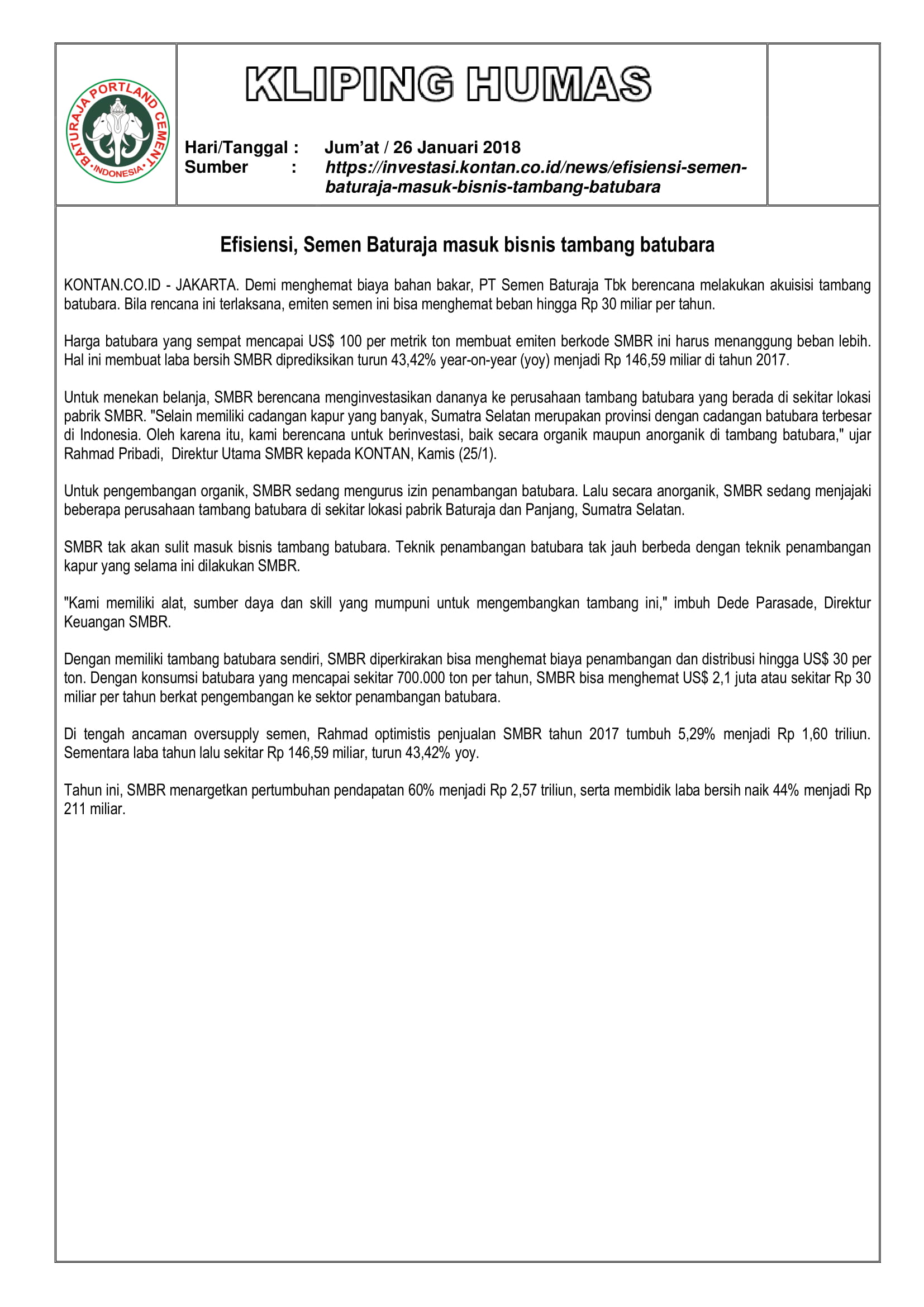 Kliping Media : Efisiensi, Semen Baturaja Masuk Bisnis Tambang Baturbara