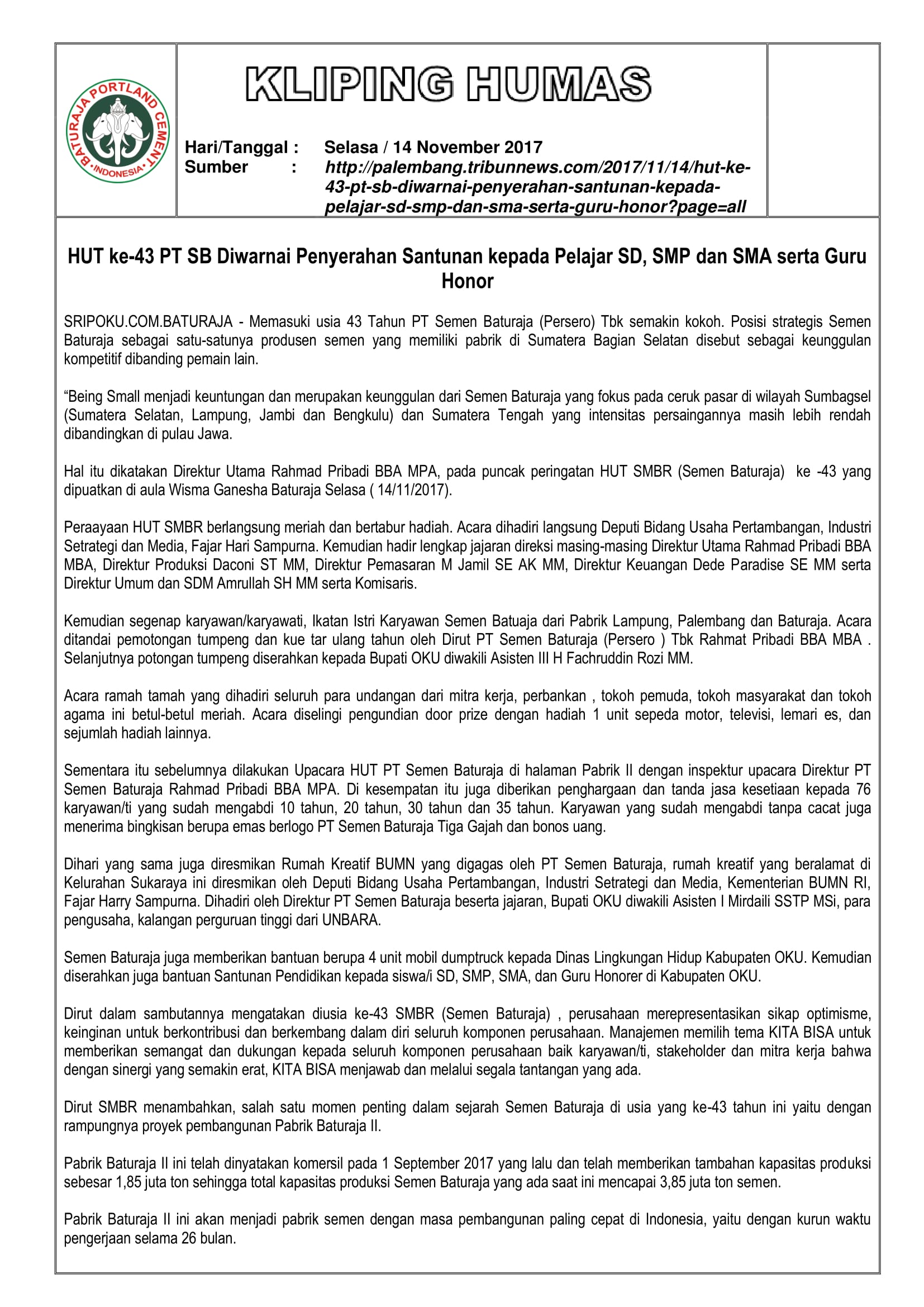 Kliping Media : HUT ke-43 PT Semen Baturaja (Persero) Tbk Diwarnai Penyerahan Santunan kepada Pelajar SD, SMP, dan SMA serta Guru Honor