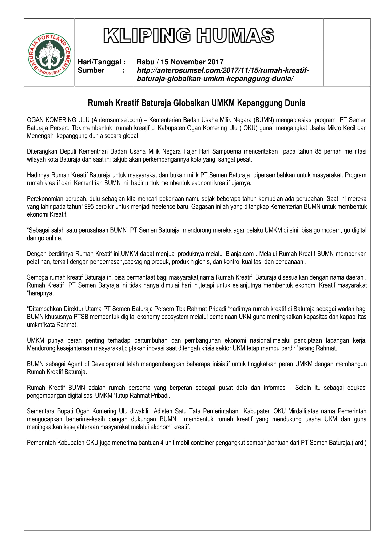 Kliping Media : Rumah Kreatif Baturaja Globalkan UMKM ke Panggung Dunia