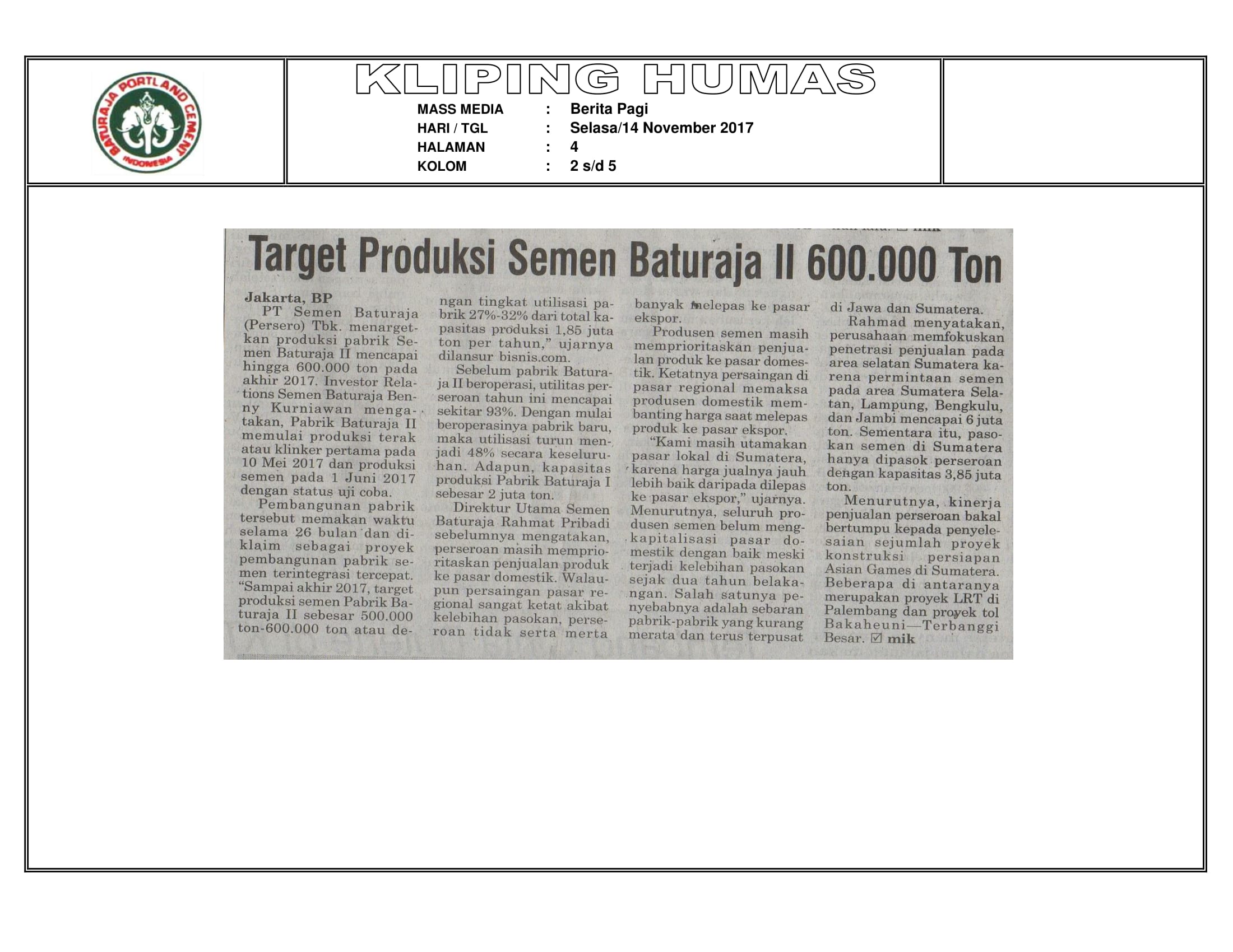 Kliping Media : Target Produksi Semen Baturaja II 600,000 Ton
