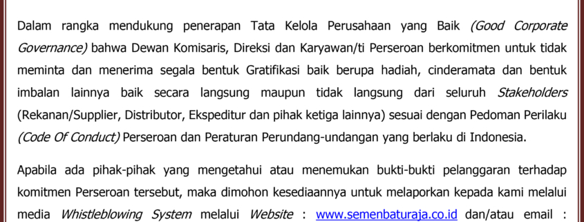 https://semenbaturaja.co.id/wp-content/uploads/2020/05/KOMITMEN-PT-SEMEN-BATURAJA-GRATIFIKASI-2020.jpg20481569Admin SMBRhttps://semenbaturaja.co.id/wp-content/uploads/2026/01/LOGO-SMBR-BARU-Persero.pngAdmin SMBR2020-05-11 15:43:082020-05-11 15:43:09Komitmen PT Semen Baturaja (Persero) Tbk Terhadap Penerapan Tata Kelola Perusahaan Yang Baik (GCG) Tentang Larangan Meminta Atau Menerima Gratifikasi Tahun 2020