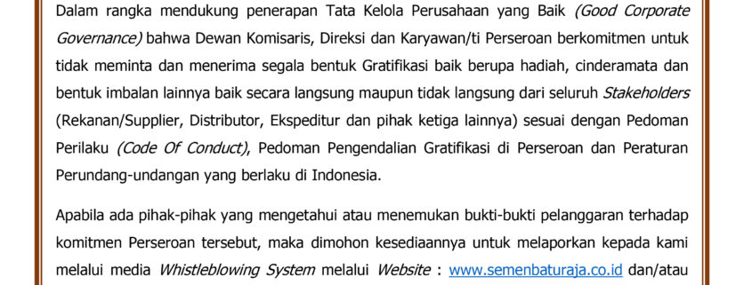 https://semenbaturaja.co.id/wp-content/uploads/2021/04/Komitmen-SMBR-Tentang-Gratifikasi-Tahun-2021.jpg20481448Admin SMBRhttps://semenbaturaja.co.id/wp-content/uploads/2026/01/LOGO-SMBR-BARU-Persero.pngAdmin SMBR2021-04-26 11:01:272021-04-26 11:02:09Komitmen PT Semen Baturaja (Persero) Tbk Terhadap Penerapan Tata Kelola Perusahaan Yang Baik (GCG) Tentang Larangan Meminta Atau Menerima Gratifikasi Tahun 2021