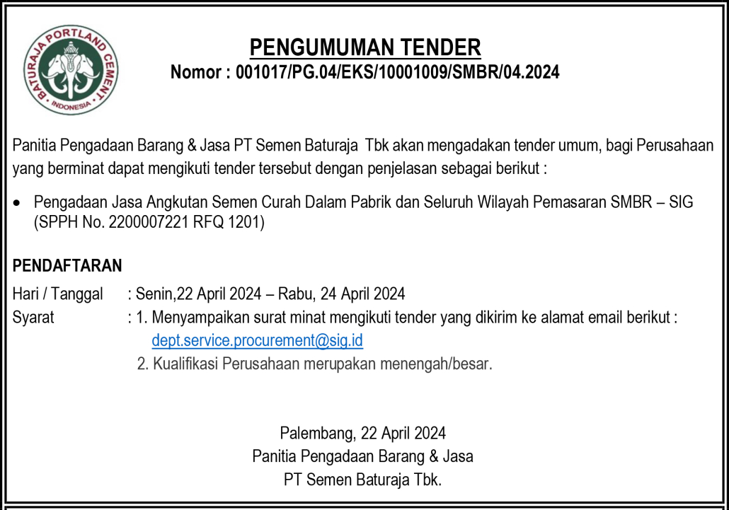 Panitia Pengadaan Barang PT Semen Baturaja Tbk akan mengadakan Pelelangan, bagi Perusahaan yang berminat dapat mengikuti Pelelangan tersebut dengan penjelasan sebagai berikut: