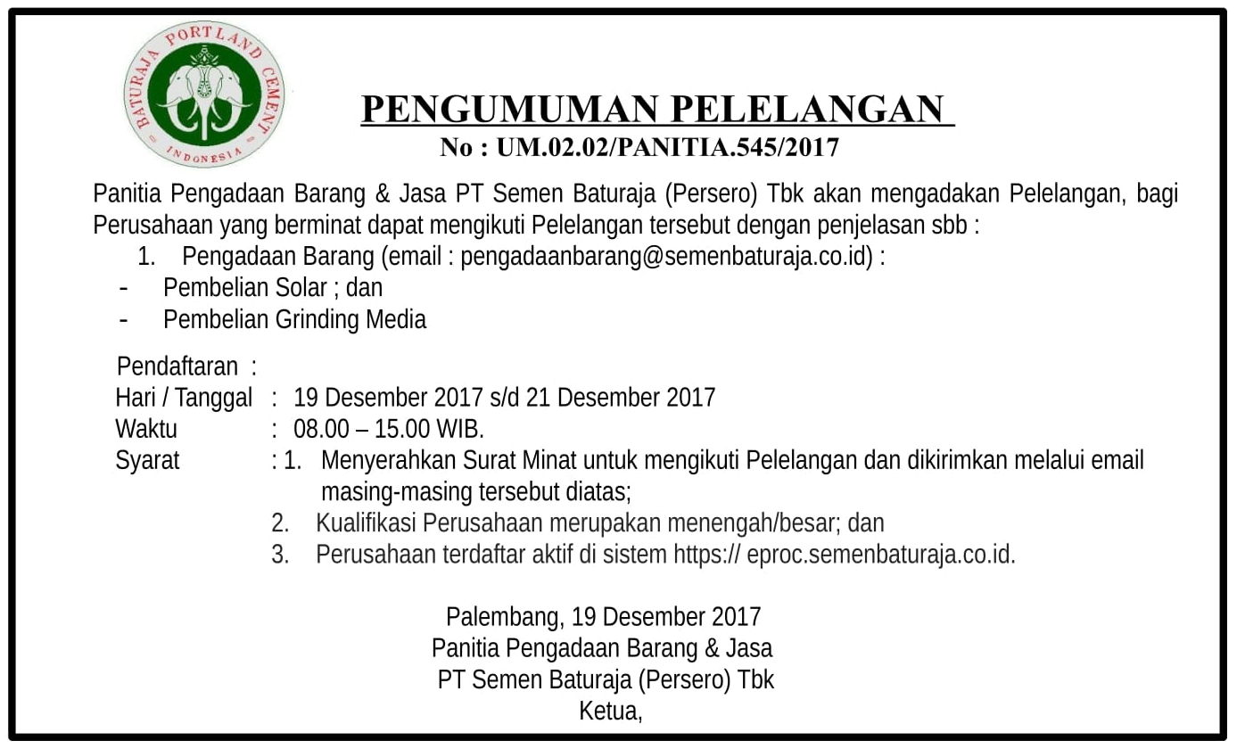 Panitia Pengadaan Barang PT Semen Baturaja (Persero) Tbk akan mengadakan Pelelangan, bagi Perusahaan yang berminat dapat mengikuti Pelelangan tersebut dengan penjelasan sebagai berikut :