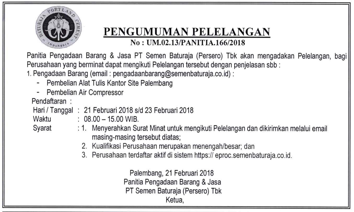 Panitia Pengadaan Barang PT Semen Baturaja (Persero) Tbk akan mengadakan Pelelangan, bagi Perusahaan yang berminat dapat mengikuti Pelelangan tersebut dengan penjelasan sebagai berikut :