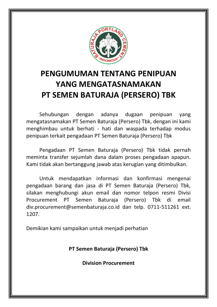 Laporkan perbuatan berindikasi pelanggaran yang terjadi di lingkungan PT Semen Baturaja (Persero) Tbk.