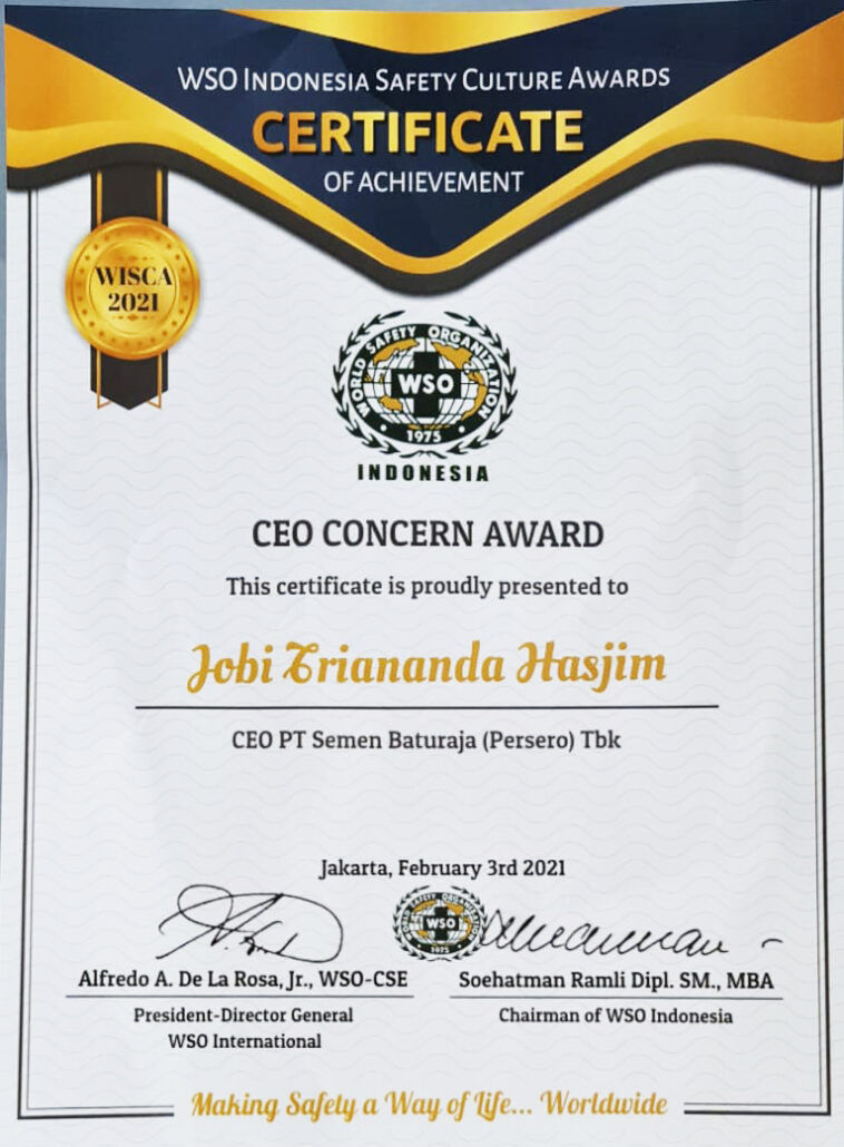 Pencapaian penting ini akan terus ditingkatkan dengan menjalankan Sistem Manajemen K3, tentu saja dengan dukungan dan pembinaan dari Direksi Semen Baturaja yaitu Bapak Jobi Triananda Hasjim selaku Direktur Utama, Direktur Produksi dan Pengembangan Bapak Daconi, Direktur Umum & SDM Bapak Amrullah, Direktur Keuangan Bapak M.Jamil dan Direktur Pemasaran Bapak Mukhamad Saifudin.