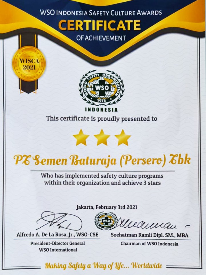 PALEMBANG – Pada WISCA tahun 2021, PT Semen Baturaja (Persero) Tbk merupakan salah satu dari 21 Perusahaan yang mendapatkan penghargaan budaya safety level 3 (Bronze/ Perunggu). Penilaian dilakukan secara virtual pada tanggal 22 Januari 2021 oleh salah satu Chairman of WSO Indonesia yaitu Bapak Soehatman Ramli. Penganugerahan penghargaan juga dilakukan secara virtual yang diikuti oleh perusahaan peserta.