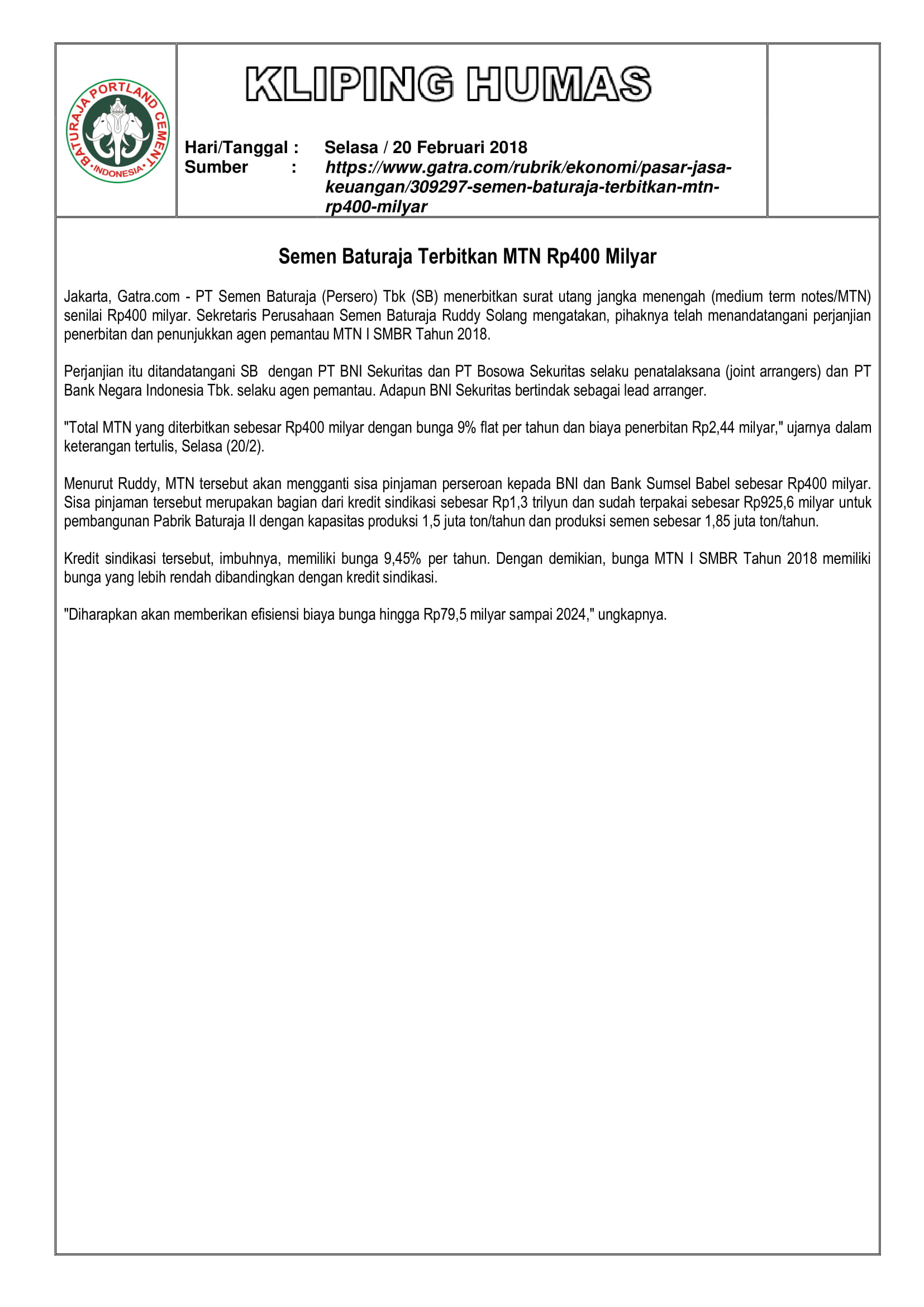 SEMEN BATURAJA TERBITKAN MTN RP400 MILIAR