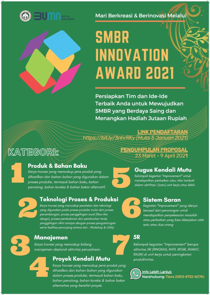 Semen Baturaja mengadakan SMBR Innovation Award 2021 yang diikuti oleh Seluruh Insan Semen Baturaja. Acara ini merupakan ajang kompetisi ide inovasi di lingkungan Semen Baturaja. Ada 7 Kategori yang dilombakan yaitu Produk & Bahan Baku, Teknologi Proses & Produksi, Manajemen, Gugus Kendali Mutu Sistem Saran, dan 5R.
