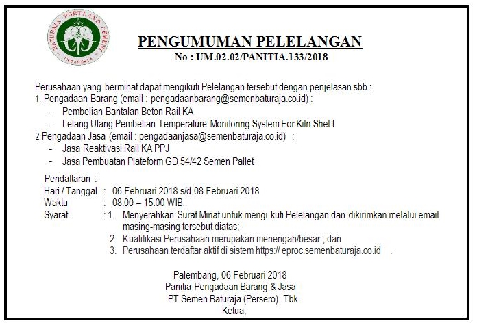 Panitia Pengadaan Barang PT Semen Baturaja (Persero) Tbk akan mengadakan Pelelangan, bagi Perusahaan yang berminat dapat mengikuti Pelelangan tersebut dengan penjelasan sebagai berikut :