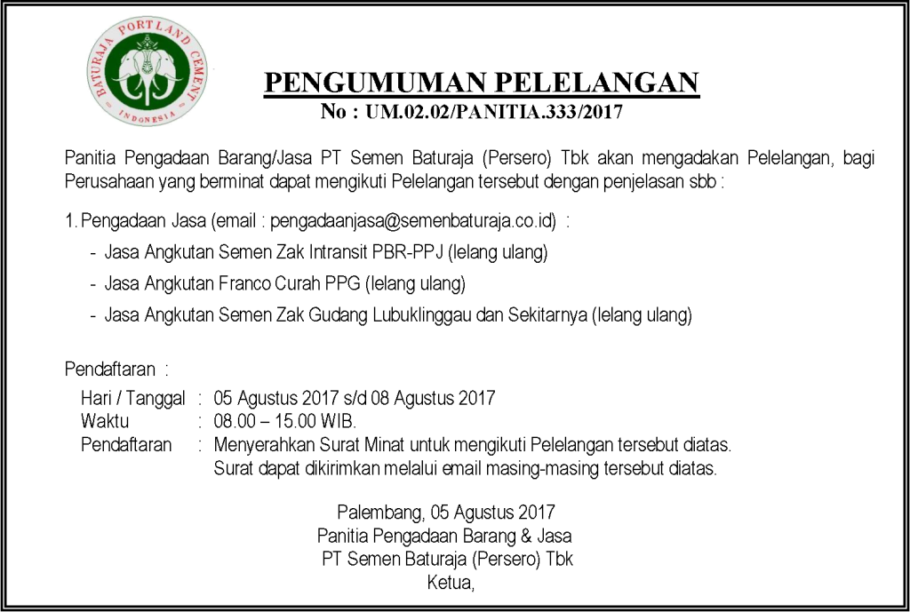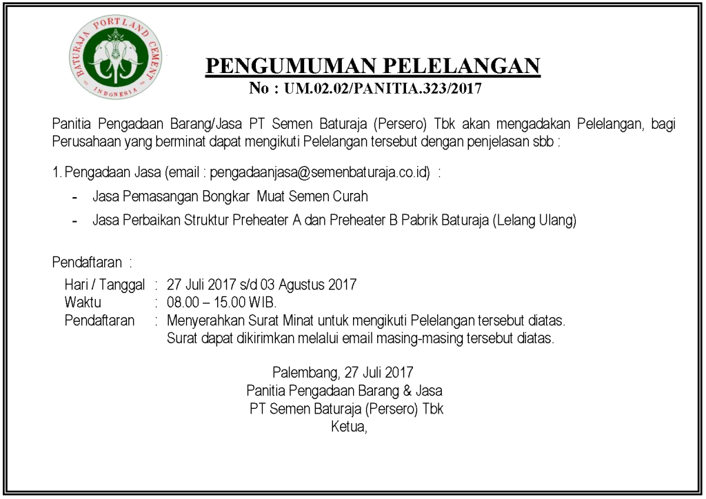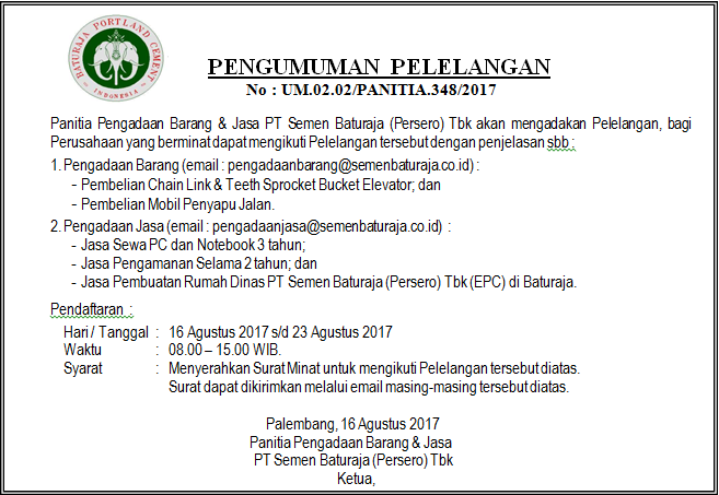 Panitia Pengadaan Barang PT Semen Baturaja (Persero) Tbk akan mengadakan Pelelangan, bagi Perusahaan yang berminat dapat mengikuti Pelelangan tersebut dengan penjelasan sebagai berikut :