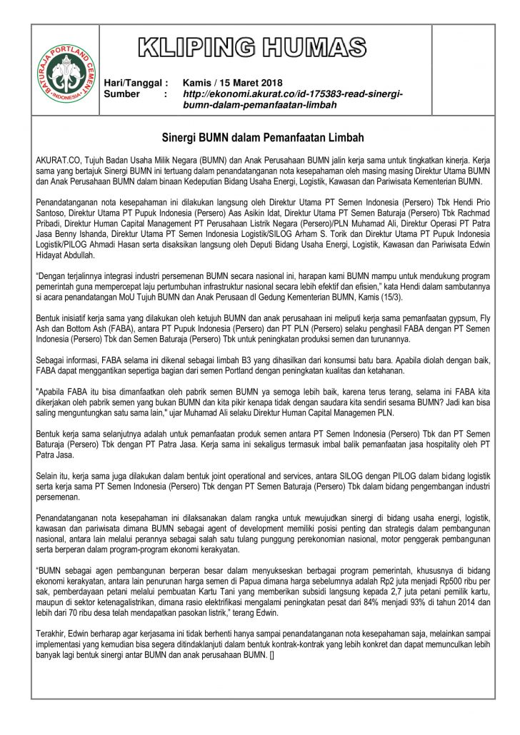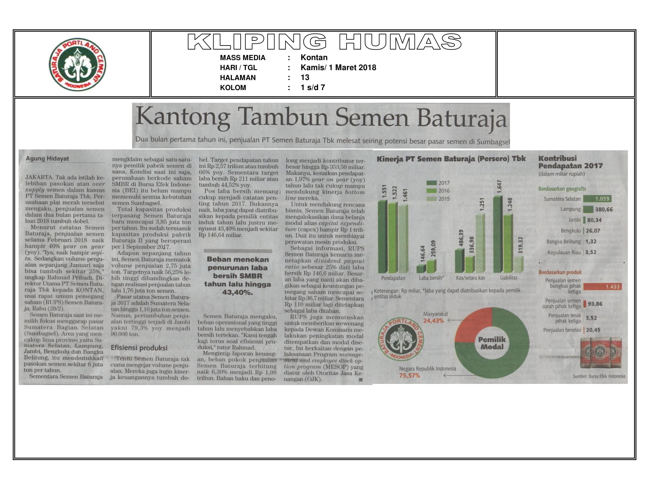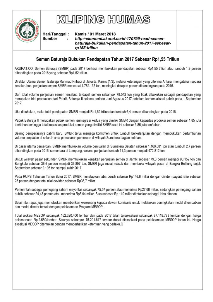 Admin SMBR 2018-05-14 16:12:16 2018-05-14 16:12:16 Semen Baturaja Bukukan Pendapatan Tahun 2017 Sebesar Rp1,56 Trilliun