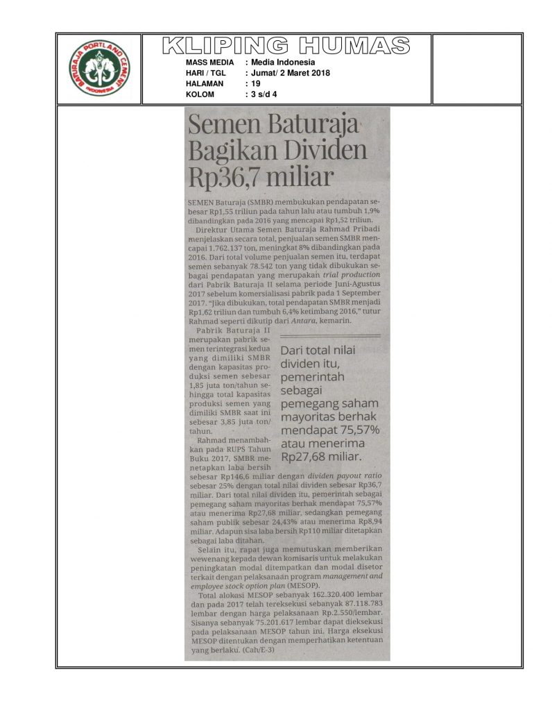 Admin SMBR 2018-05-14 16:07:13 2018-05-14 16:07:13 Semen Baturja Bagikan Dividen Rp36,7 miliar