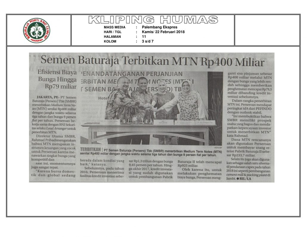 Admin SMBR 2018-05-14 16:10:28 2018-05-14 16:10:28 Semen Baturaja Terbitkan MTN Rp400 miliar