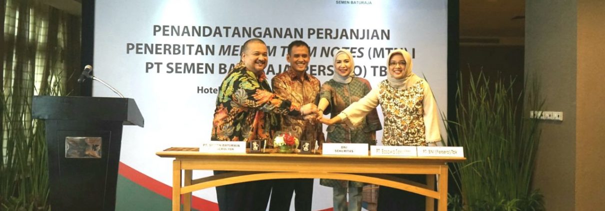 JAKARTA – PT Semen Baturaja (Persero) Tbk (SMBR) menerbitkan Medium Term Notes (MTN) senilai Rp400 miliar dengan jangka waktu selama tiga tahun dan bunga 9 persen flat per tahun. Perseroan bekerja sama dengan BNI Sekuritas selaku Lead Arranger, Bosowa Sekuritas selaku Arranger dan Bank BNI selaku agen pemantau untuk penerbitan MTN. Direktur Utama SMBR Rahmad Pribadi, pada hari Selasa (20/02) saat penandatanganan penerbitan MTN di Hotel JW Marriot mengemukakan bahwa MTN merupakan instrumen keuangan yang cocok untuk Perseroan karena menawarkan tingkat bunga yang kompetitif. Saat ini, momentumnya menurut Rahmad juga sangat tepat. “Karena bursa domestik dan global sedang berada dalam kondisi yang baik,” katanya.