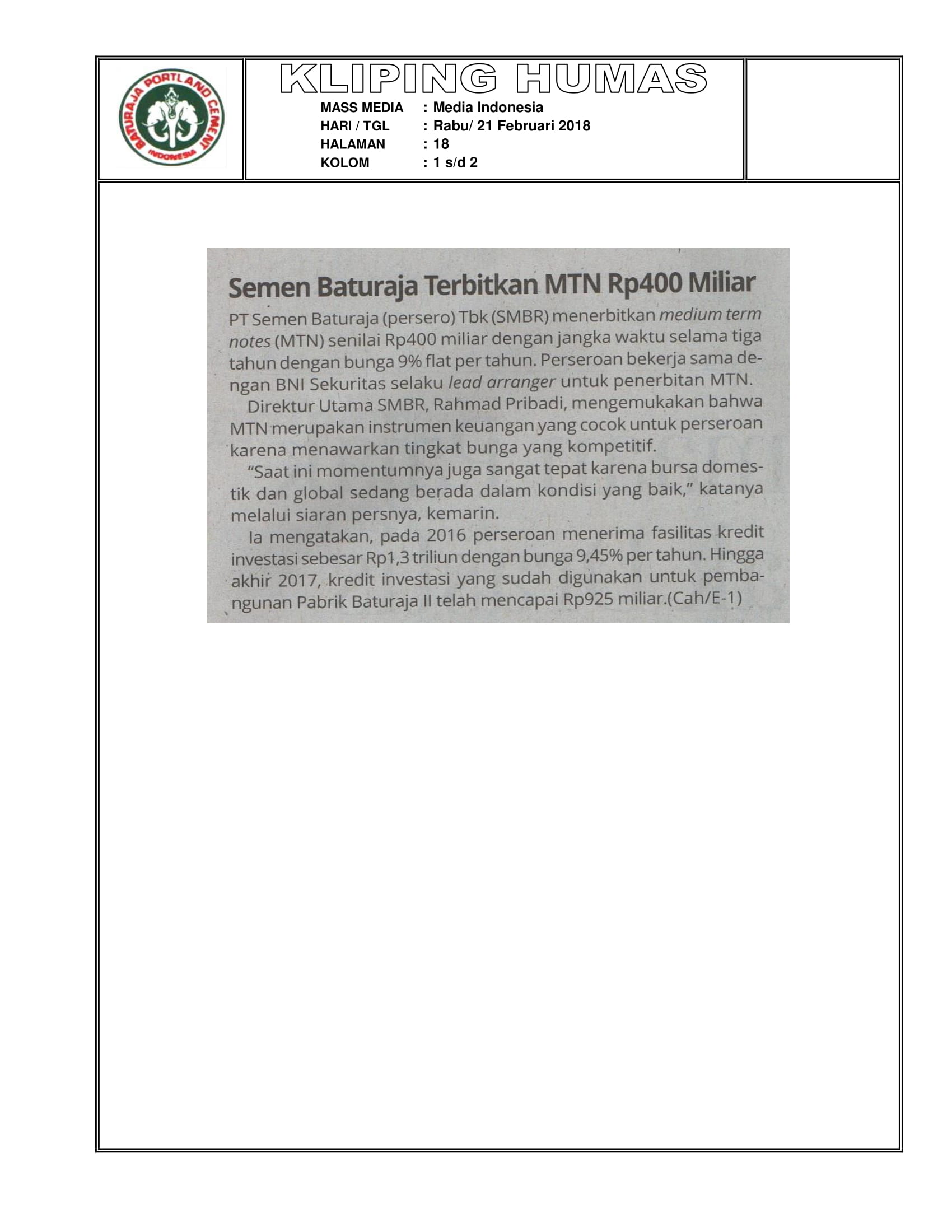 Dalam rangka penerbitan MTN ini, Perseroan mendapat peringkat idA dari PEFINDO dengan outlook stabil, “Ini membuktikan bahwa SMBR memiliki prospek usaha yang bagus dan mendapatkan kepercayaan investor untuk menerbitkan MTN” kata Rahmad. Dana MTN rencananya akan digunakan Perseroan untuk membayar utang retensi Pabrik Baturaja II sebesar Rp233,7 miliar. Selain itu juga akan digunakan sebagai salah satu alternatif pendanaan capex pada tahun 2018 ini seperti pembangunan cement mill & packing plant di Jambi. (Humas SMBR)